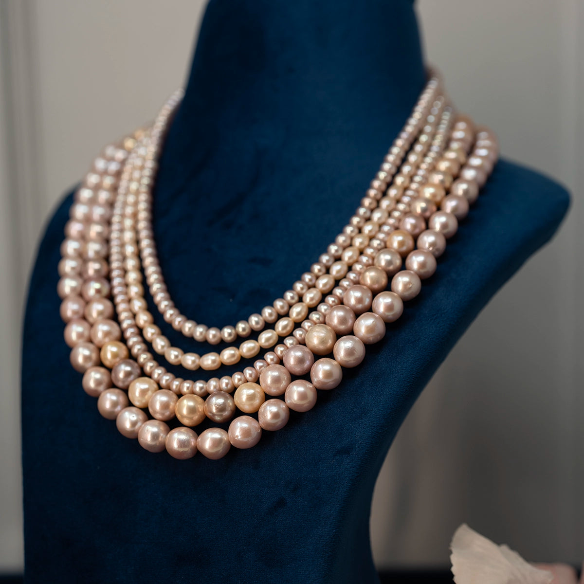 Add timeless charm to your look with this 5-layer pearl necklace featuring round and rice-shaped pink pearls. Perfect for special occasions or everyday sophistication.