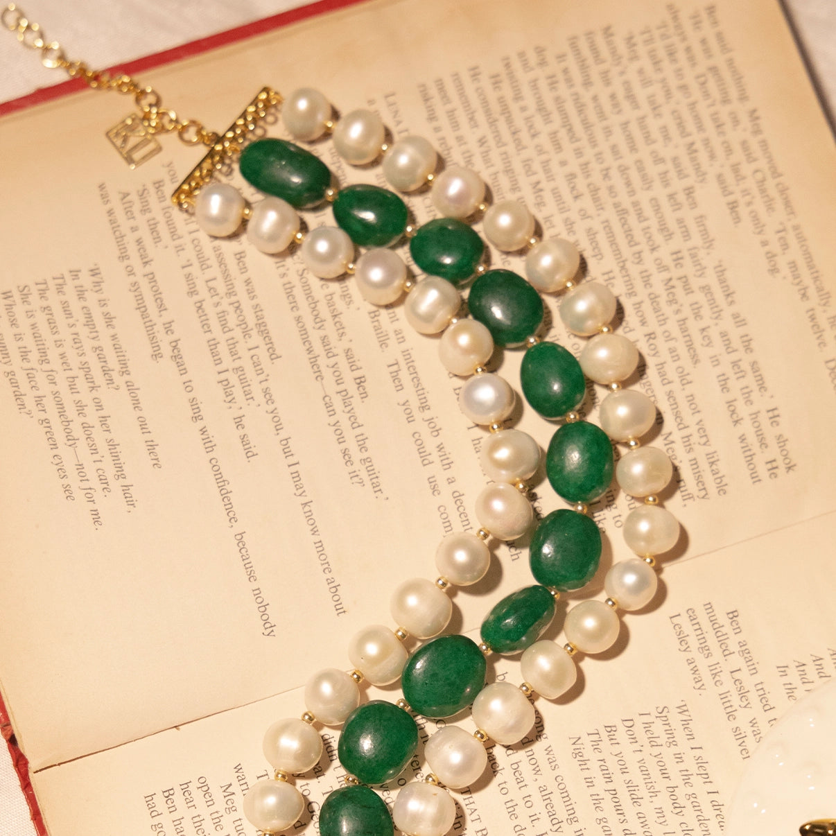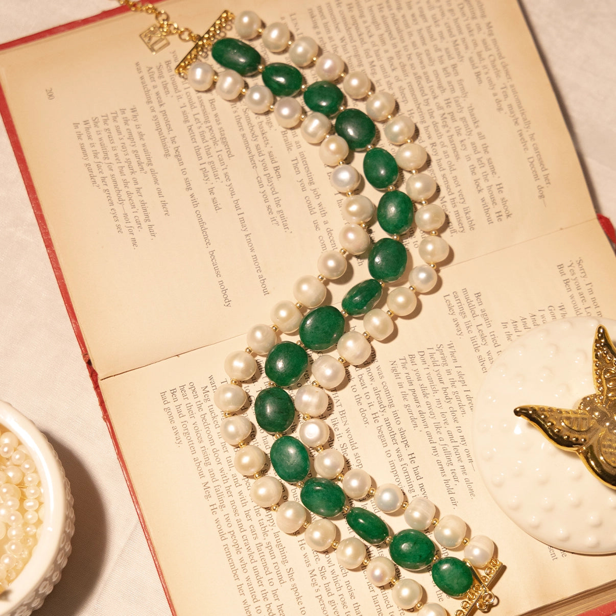 Draped in luminous freshwater pearls and deep green onyx tumbles, this choker is made to draw every eye in the room. The pearls glow with a soft radiance, while the deep green stones bring intensity,. together creating a piece that is remarkably graceful. It’s not just jewelry, it’s a statement of presence. Wear it to celebrations, soirées, or even with a simple saree, and feel the confidence it adds to your aura.